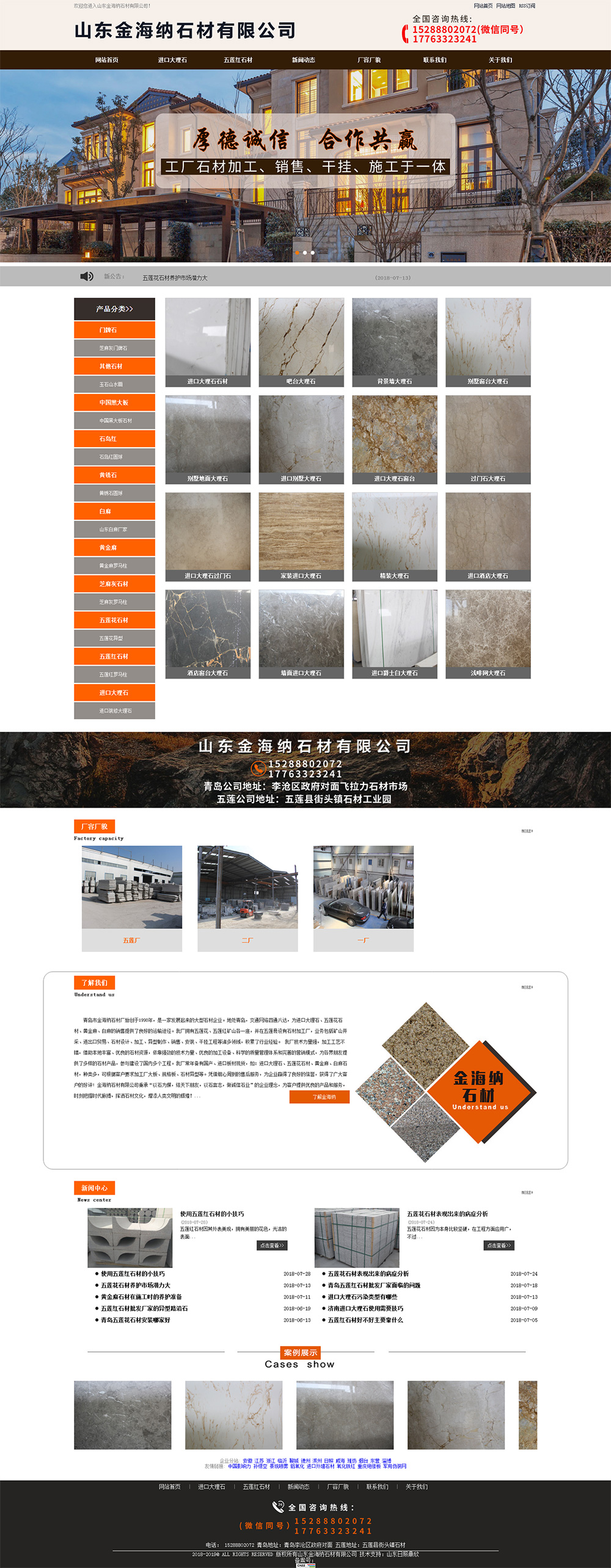 • 青島市金海納石材廠始 創(chuàng)于1998年,是一家發(fā)展起來的大型石材企業(yè)。地處青島,交通網(wǎng)絡(luò)四通八達,為進 口大理石、五蓮花石材、黃金麻、白麻的銷售提供了良好的運輸途徑。我廠擁 有五蓮花、五蓮紅礦山各一座,并在五蓮縣設(shè)有石材加工廠,業(yè)務(wù)包括礦山開采、進出口貿(mào)易、石材設(shè)計、加工、異型制作、銷售、安裝、干掛工程等諸多領(lǐng)域,積累了行業(yè)經(jīng)驗。 我廠技 術(shù)力量強,加工工藝不錯,借助本地優(yōu)良的石材資源,依靠強勁的技 術(shù)力量、優(yōu)良的加工設(shè)備、科學的質(zhì)量管理體系和完善的營銷模式,為各界朋友提供了多樣的石材產(chǎn)品,參與建設(shè)了國